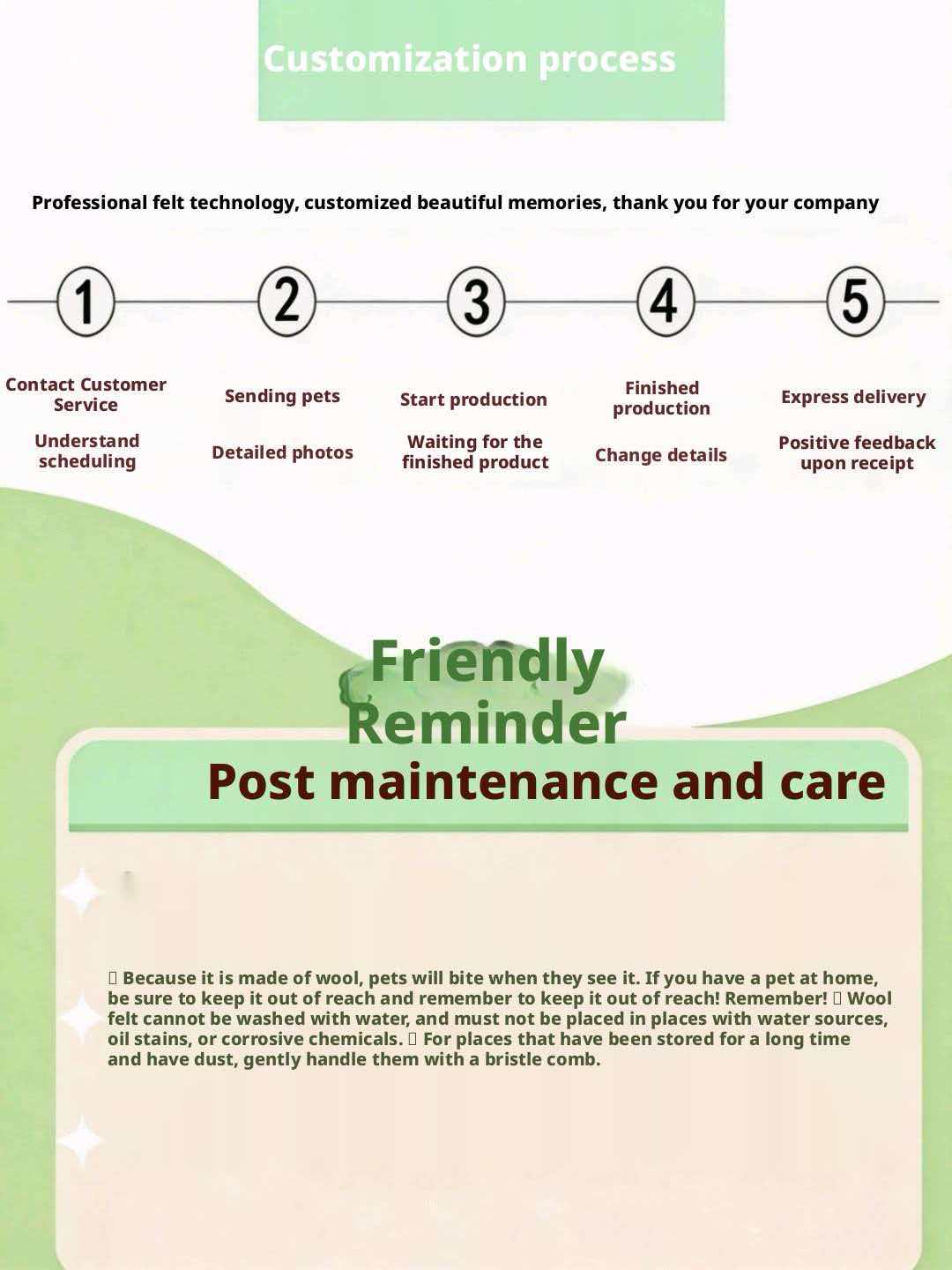 We offer you handmade wool felt pet customization. Each prick of the needle is not just for shaping, but also for replicating those sparkling memories between you and your pet. · 1:1 soul replication: Simply provide us with a clear photo of your beloved pet, and we will capture its most expressive demeanor for you - whether it's the adorable tilt of the head or the gentle gaze. We will capture every detail perfectly for you. · Fingertip warmth: We use high-quality imported wool, carefully pricked thousands of times by skilled craftsmen, to make the plush feel infinitely close to the real touch experience. · Permanent companionship: It doesn't shed hair, get sick, or age. When you are away or miss it, looking down at it fills your heart with a sense of comfort and warmth. Customize a mini "it" and keep your love within reach.